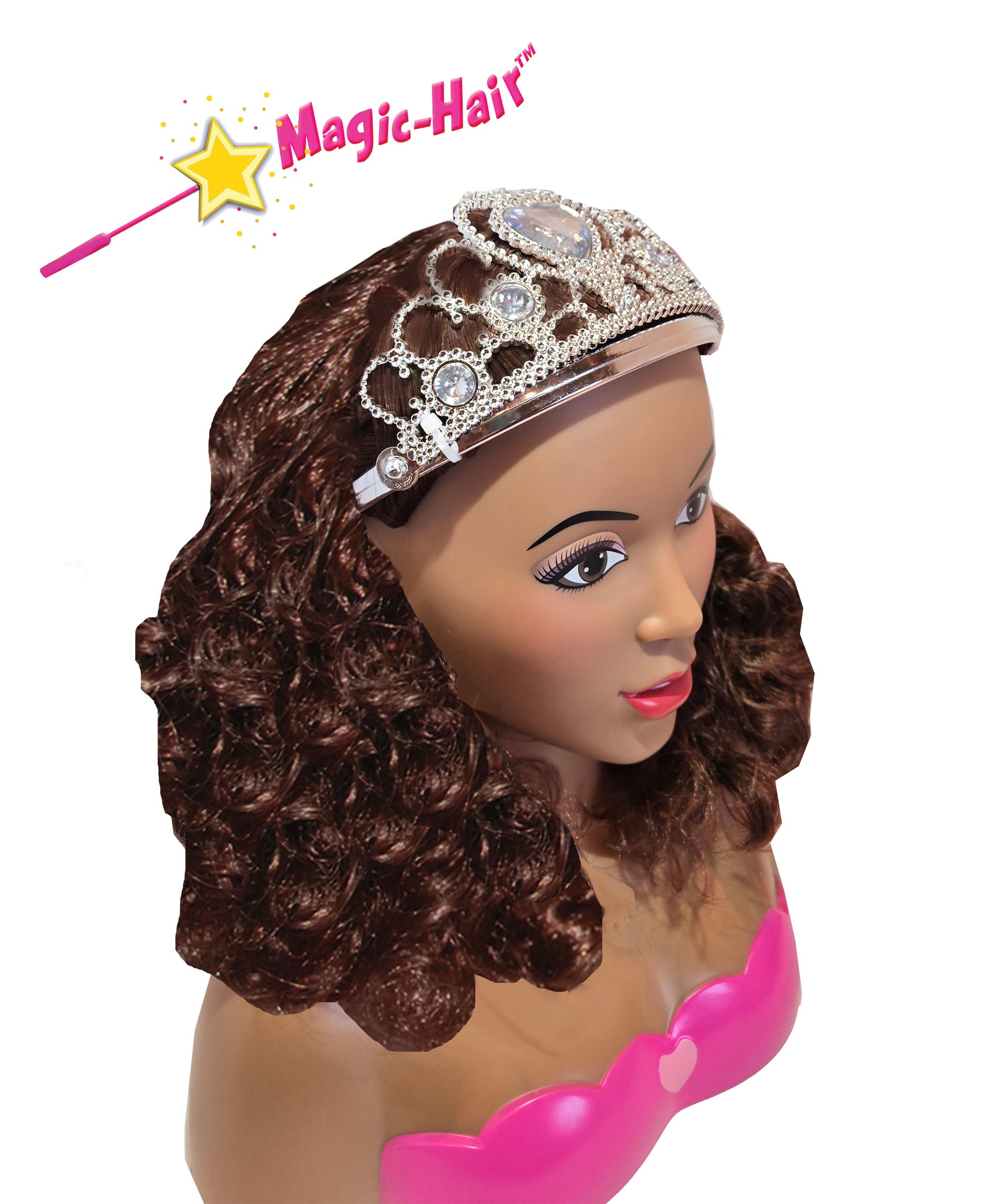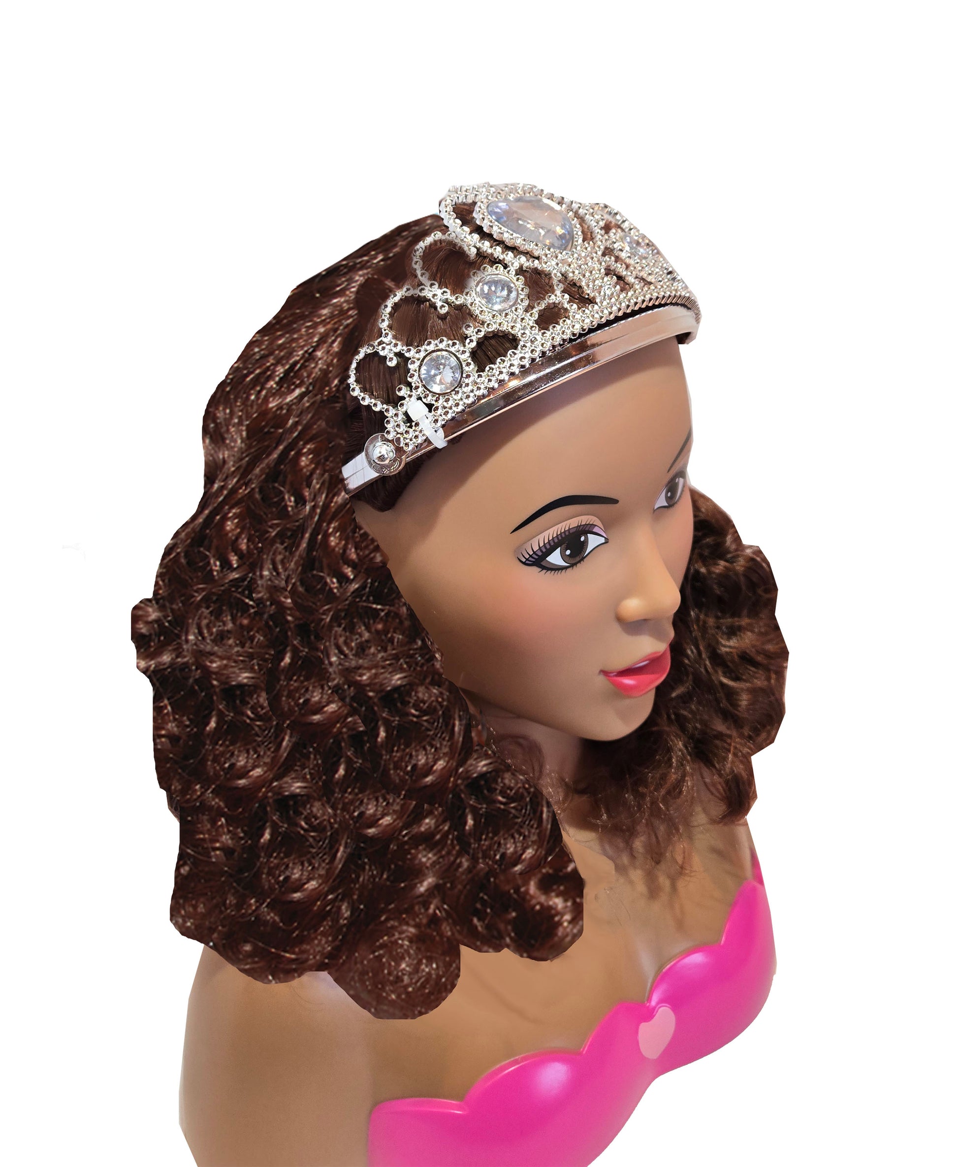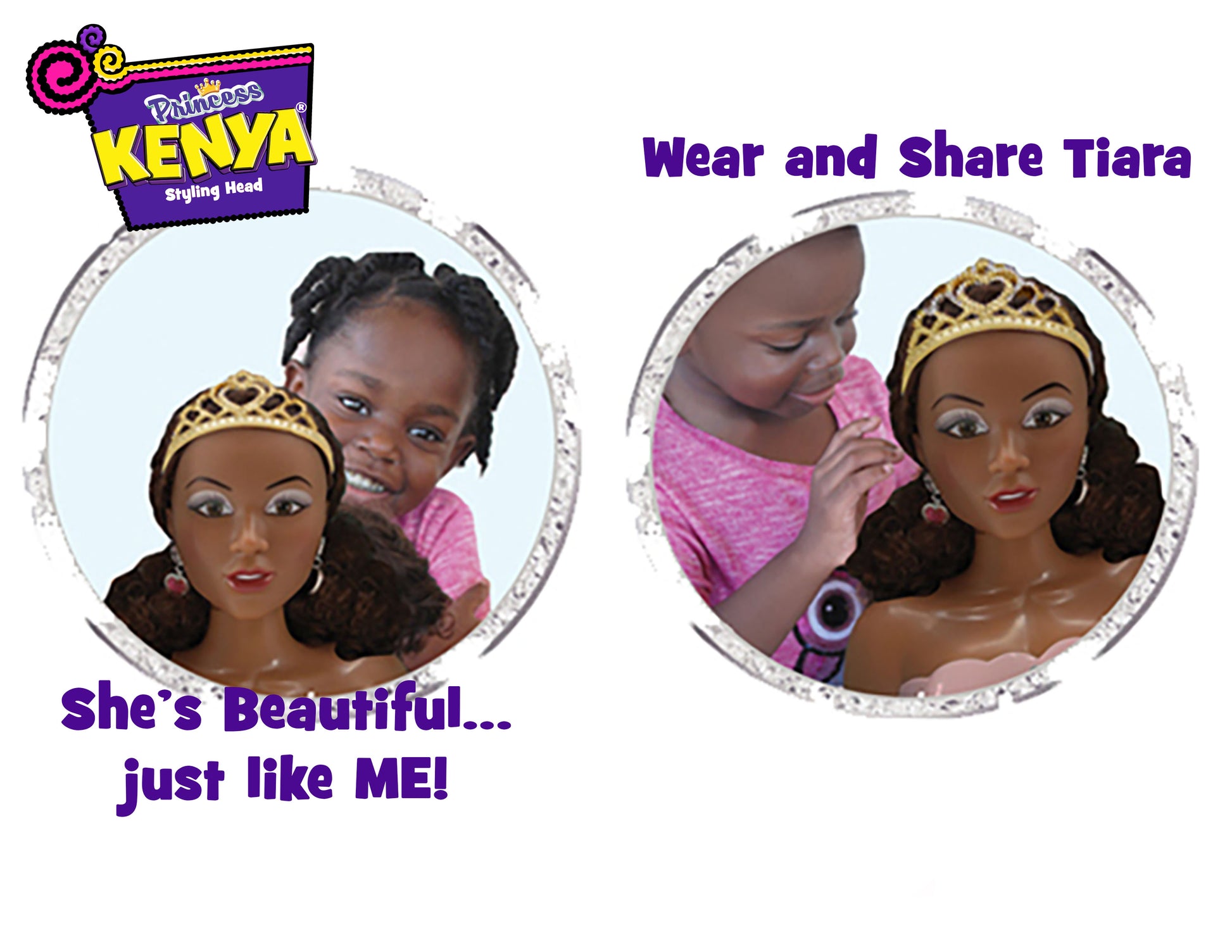 OUR OVERSIZED 12" TALL STYLING HEAD MAKES IT EASY FOR LITTLE GIRLS TO PRACTICE AND LEARN HOW TO STYLE HAIR! BRAID IT! BEAD IT! PRINCESS KENYA® LOVES HAVING HER GORGEOUS HAIR STYLED OVER AND OVER AGAIN! GIRLS CAN STYLE KENYA® AS A BEAUTIFUL PRINCESS WEARING HER CROWN TIARA AND EARRINGS! GIRLS CAN WEAR HER CROWN TOO! AVAILABLE IN TWO SKIN TONES/HAIR COLORS: MEDIUM BROWN AND DARK BROWN.
